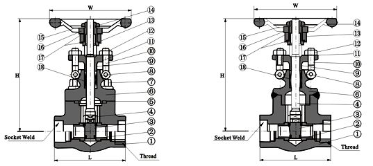 锻钢闸阀有三种阀盖设计,第一种是螺栓型阀盖,通过凹凸面连接,采用不锈钢带与柔性石墨缠绕垫片,按需求也可采用环连接,第二种是焊接型阀盖,通过螺纹密封后焊接,按需求也可直接采用刚性焊接,第三种是自密封阀盖,通过螺纹与自密封阀盖连接。